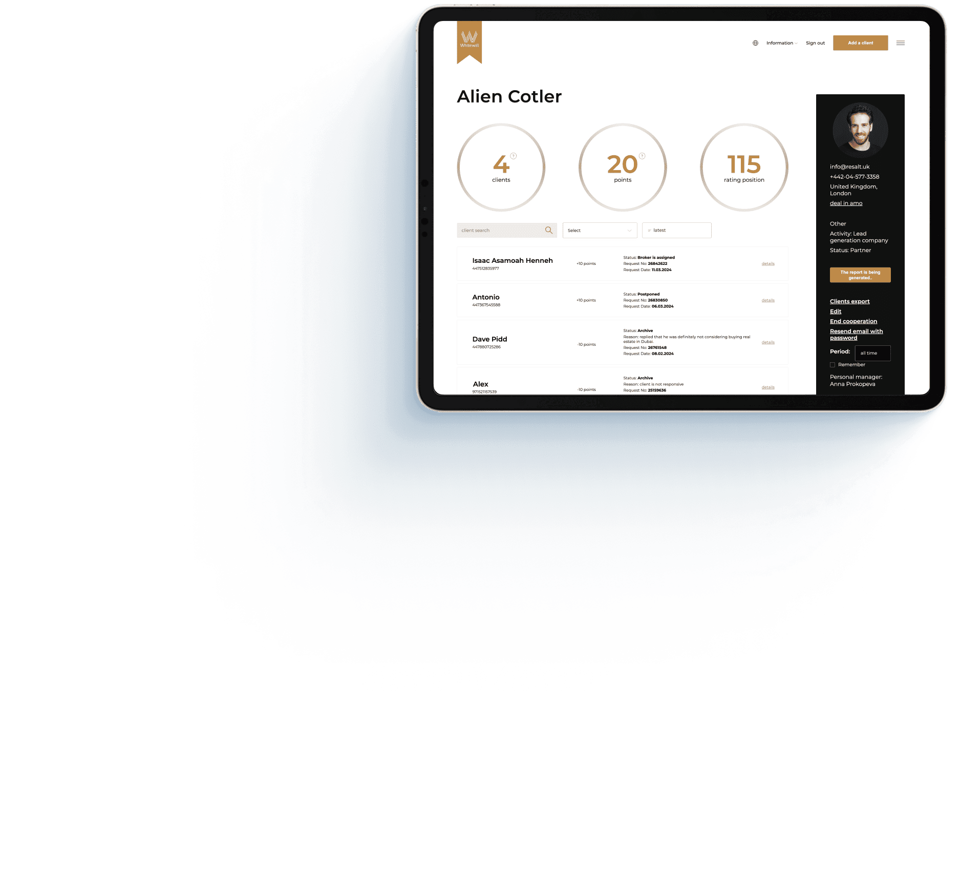 Initially, the client had earmarked £600 000 for the acquisition of an apartment spanning at least 50 m2. Throughout the process, concerns arose regarding the steep real estate prices. They even twice reserved plots in the Bellamy project, only to retract their decisions. There were periods of unresponsiveness, weeks would pass without returning calls, and they would sporadically travel abroad. Nonetheless, Sabina remained steadfast, continually presenting alternative purchase options.